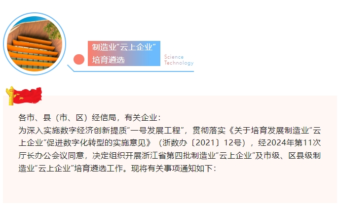 各市、縣(市、區(qū))經(jīng)信局,有關(guān)企業(yè):為深入實(shí)施數(shù)字經(jīng)濟(jì)創(chuàng)新提質(zhì)“一號(hào)發(fā)展工程”,貫徹落實(shí)《關(guān)于培育發(fā)展制造業(yè)“云上企業(yè)”促進(jìn)數(shù)字化轉(zhuǎn)型的實(shí)施意見(jiàn)》(浙數(shù)辦〔2021〕12號(hào)),經(jīng)2024年第11次廳長(zhǎng)...