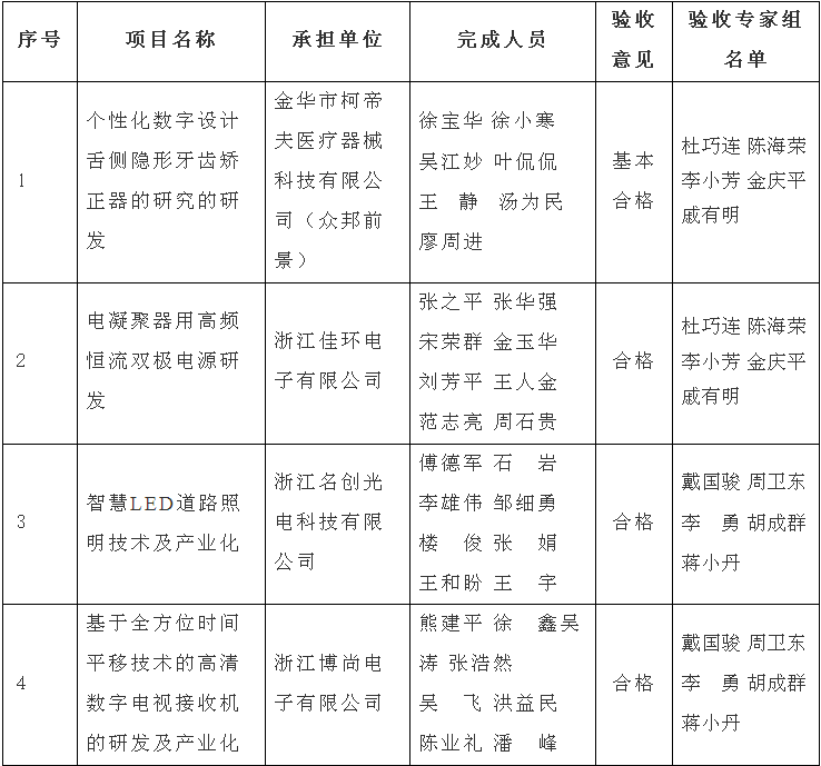根據《金華市級科技計劃項目驗收管理辦法》(金市科字〔2015〕83號)規(guī)定,現將金華市柯帝夫醫(yī)療器械科技有限公司(眾邦前景)、浙江佳環(huán)電子有限公司、浙江名創(chuàng)光電科技有限公司、浙江博尚電子有限公司承擔的《個性化數字設計舌側隱形牙齒矯正器的研究的研發(fā)》、《電凝聚器用高頻恒流雙極電源研發(fā)》、《智慧LED道路照明技術及產業(yè)化》和《基于全方位時間平移技術的高清數字電視接收機的研發(fā)及產業(yè)化》4個市級科技計劃項目驗收結果予以公示,接受社會監(jiān)督,公示期從2018年1月10日至1月17日止。