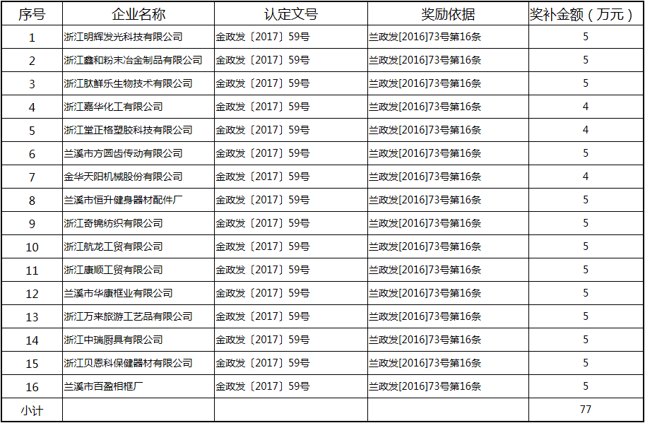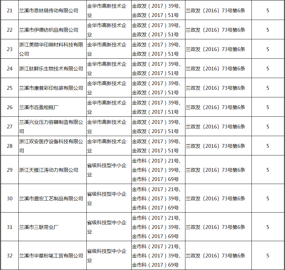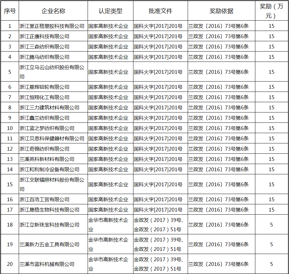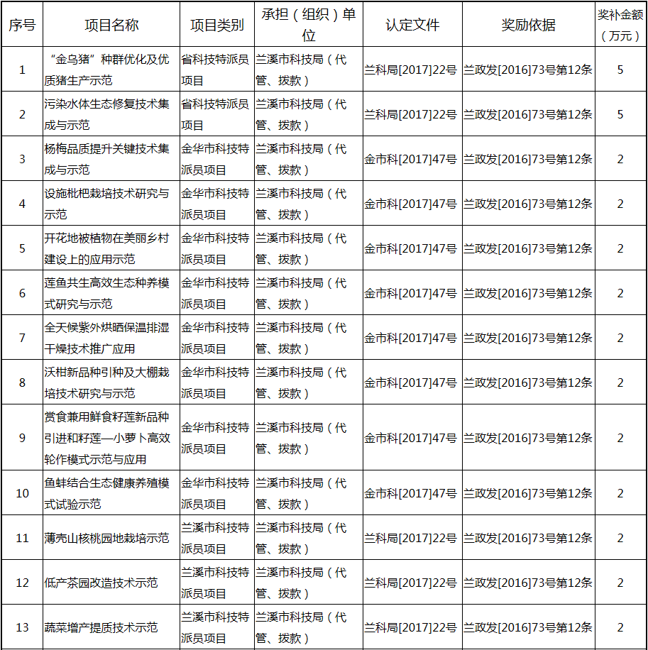 根據(jù)《關于實施創(chuàng)新驅動戰(zhàn)略大力推進大眾創(chuàng)業(yè)萬眾創(chuàng)新的若干意見》(蘭政發(fā)〔2016〕73號)和《蘭溪市科技創(chuàng)新券實施管理辦法》(蘭科局〔2016〕17號)等文件精神,現(xiàn)將2017年度科技創(chuàng)新專項資金獎勵及補助方案予以公示,公示期五個工作日,自2018年 7月3日至 7月9日。公示期內,如對公示擬補助對象有疑議的,請及時向市科技局辦公室反映。