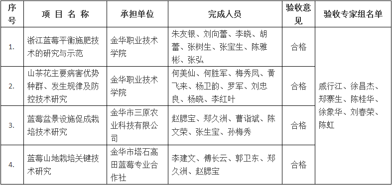 根據(jù)《金華市級科技計劃項目驗收管理辦法》(金市科字〔2015〕83號)規(guī)定,現(xiàn)將金華職業(yè)技術(shù)學(xué)院承擔(dān)的《浙江藍(lán)莓平衡施肥技術(shù)的研究與示范》等市級科技計劃項目驗收結(jié)果予以公示,接受社會監(jiān)督,公示期從2018年7月17日至2018年7月24日止。任何單位和個人對驗收意見持有異議的,應(yīng)當(dāng)在公示期內(nèi)書面向市科技局提出異議,單位應(yīng)采用書面形式并加蓋公章,個人應(yīng)采用實名提出異議。