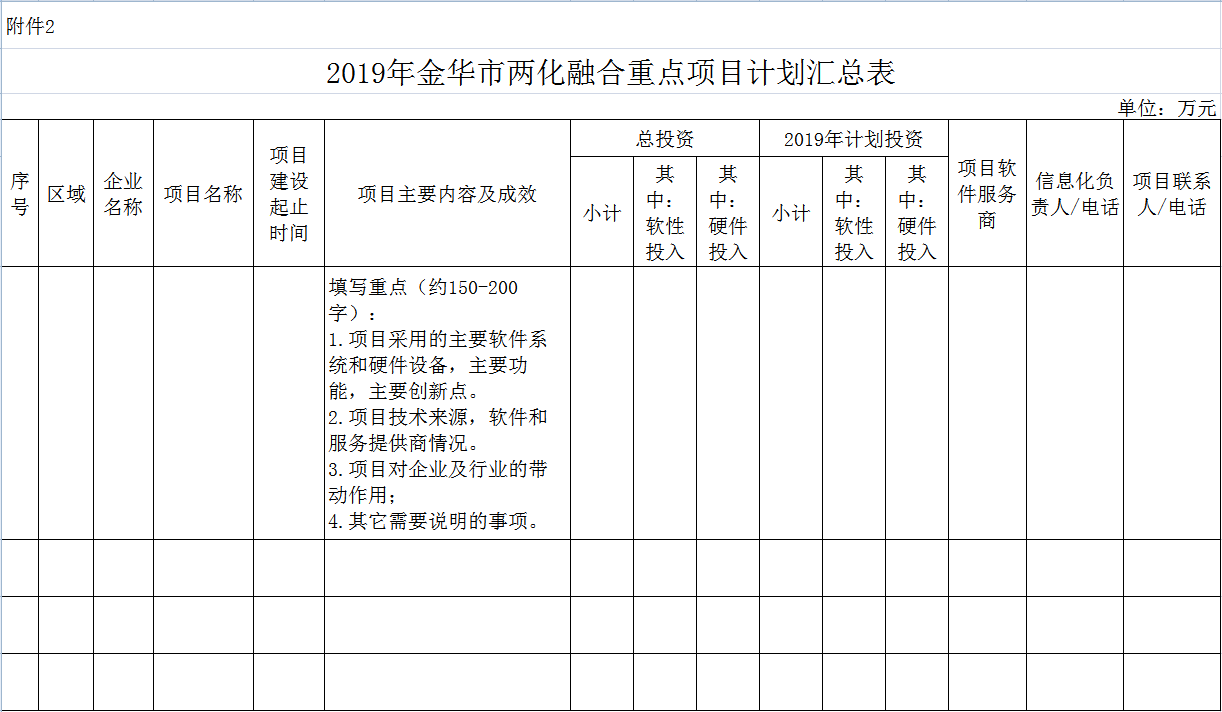 (三)請各地認真組織,動員企業(yè)積極申報。由申報企業(yè)按《金華市信息化和工業(yè)化融合重點項目管理辦法》要求填報《2019年金華市兩化融合重點項目申報表》(附件1)和《2019年金華市兩化融合重點項目計劃匯總表》(附件2),連同有關(guān)資料裝訂成冊(雙面打印);由各地經(jīng)信部門匯總《2019年金華市兩化融合重點項目計劃匯總表》(附件2)。書面申報材料二份(另需提供電子文檔),于5月30日前報送我局。