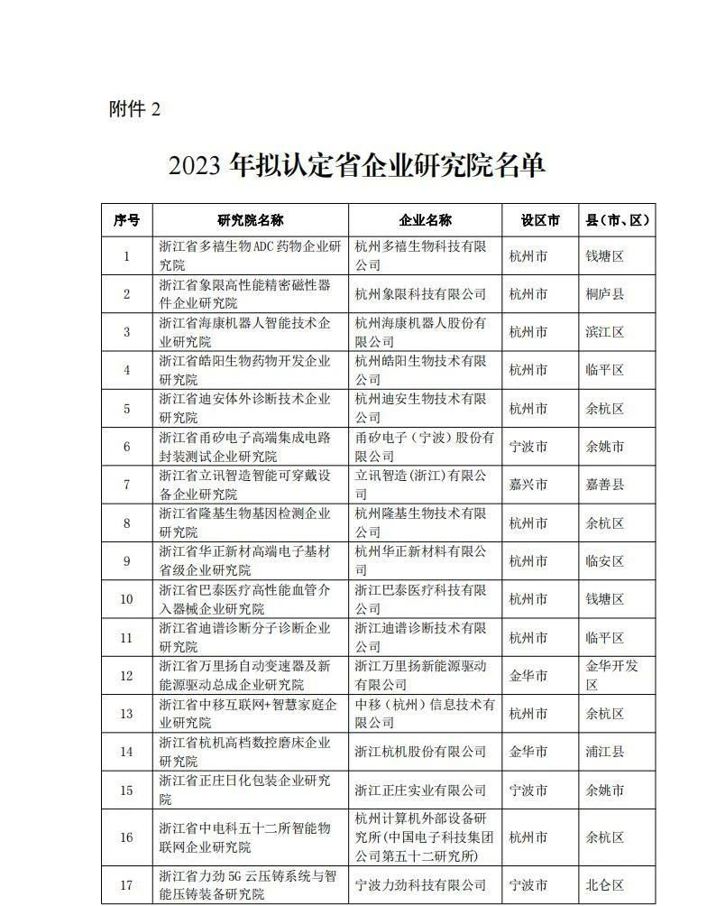 按照工作安排,我廳組織開展了2023年省重點企業(yè)研究院、省企業(yè)研究院、省高新技術(shù)企業(yè)研究開發(fā)中心認定工作。在各市科技局推薦的基礎(chǔ)上,經(jīng)評審和復(fù)核,報廳務(wù)會審議同意,擬認定(備案)“浙江省高效可靠光儲逆變器重點企業(yè)研究院”等50家重點企業(yè)研究院為省重點企業(yè)研究院、“浙江省多禧生物ADC藥物企業(yè)研究院”等265家企業(yè)研究院為省級企業(yè)研究院、“浙江省劍齒虎云服務(wù)高新技術(shù)企業(yè)研究開發(fā)中心”等1142家高新技術(shù)企業(yè)研發(fā)中心為省級高新技術(shù)企業(yè)研究開發(fā)中心,現(xiàn)予以公示(詳見附件)。公示時間7天。對公示對象有異議的,請書面向我廳反映。以單位名義提出異議的應(yīng)加蓋單位公章,以個人名義提出異議的應(yīng)簽署個人真實姓名和聯(lián)系方式。